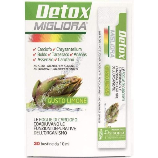 Detox è purissimo e concentrato, contiene principi attivi estratti da piante di primissima qualità. Le droghe vegetali sono miscelate per garantire un’efficace azione depurativa, diuretica e detossinante. É ideale per tutti ed è disponibile in pratiche bustine monodose al gusto di Limone.